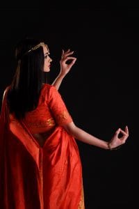 Beautiful Indian Woman in a Sari Smiling and dancing in studio.
